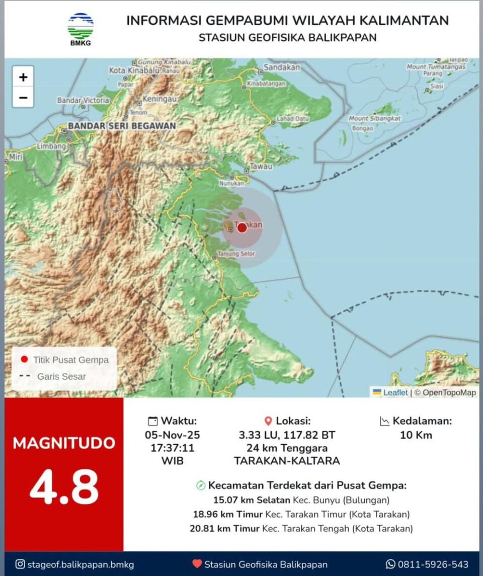 Badan Meteorologi Klimatologi dan Geofisika (BMKG) Tarakan melaporkan pusat gempa berada 24 kilometer tenggara Pulau Tarakan pada koordinat 3,33 Lintang Utara dan 117,82 Bujur Timur dengan kedalaman 10 kilometer. “Info Gempa Mag:4.8, 05-Nov-25 17:37:11 WIB, Lok: 3.33 LU – 117.82 BT (24 km Tenggara TARAKAN-KALTARA), Kedlmn: 10 Km: BMKG-BKB,” tulis BMKG dalam unggahan resminya di media sosial.